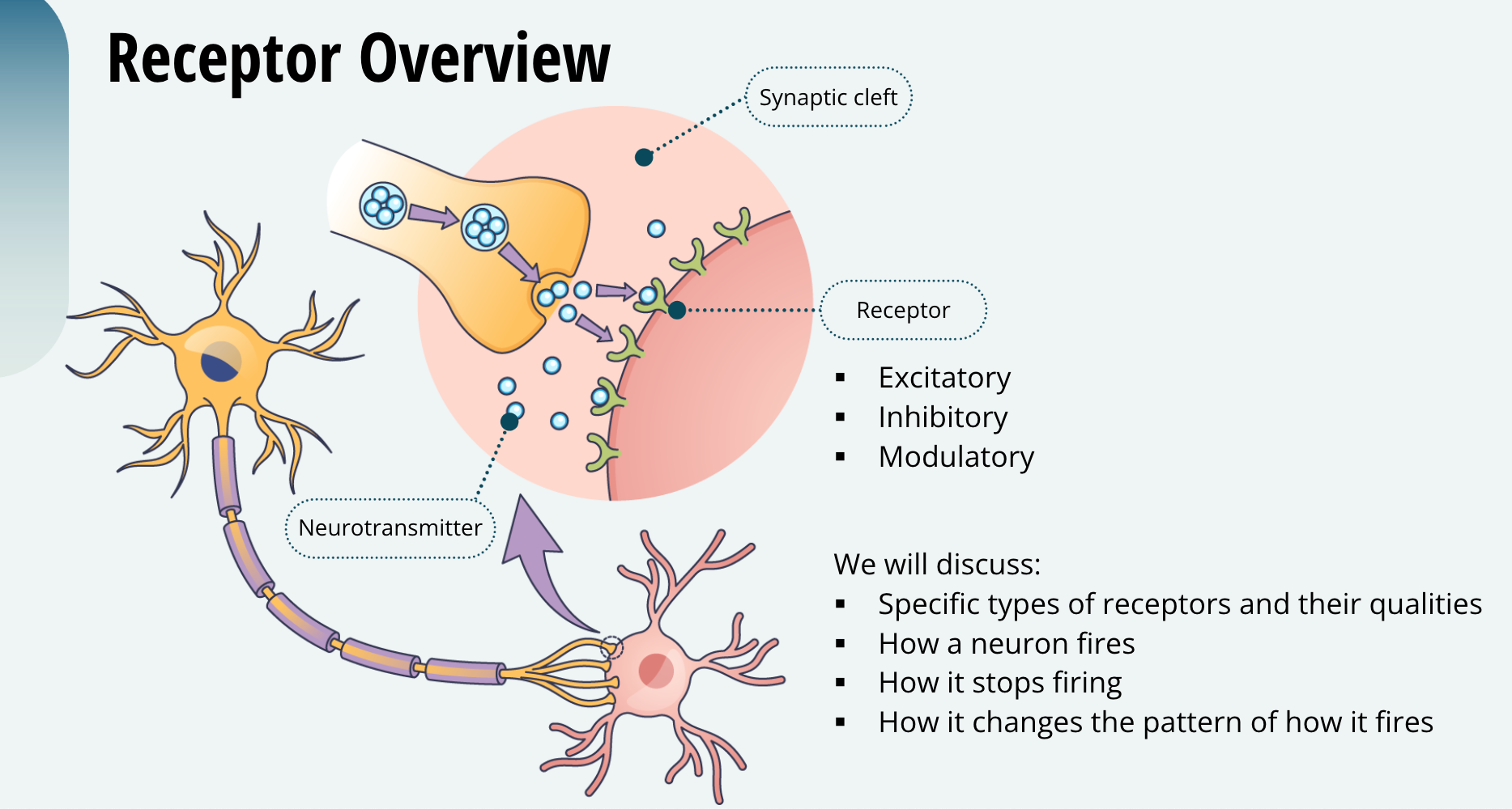 As you learned previously, once the neurotransmitter is released into the synaptic cleft, it will typically bind to a receptor. You also learned that receptors can be excitatory, inhibitory, or modulatory. Next, we will discuss specific types of receptors and the qualities they possess to make a neuron fire, make it stop firing, or change the pattern of how it fires. As you have probably figured out by now, the timing of neuronal firing is how the brain produces behaviour and cognition. So, receptors are very important.