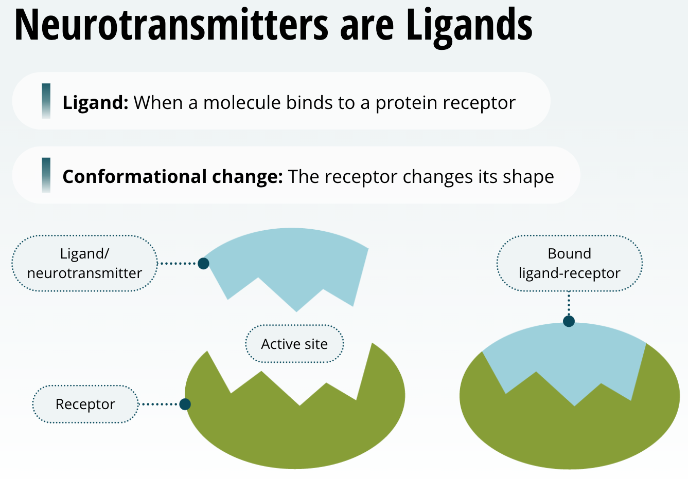 When a molecule binds to a protein receptor, we refer to it as a ligand. When a ligand binds to a receptor, it causes a change in the structure of the protein receptor, or as we say, it causes a conformational change. That means that this causes the receptor to change its shape. So, when a neurotransmitter is released into the synaptic cleft and binds to a receptor, it acts as a ligand. Neurotransmitters are in fact ligands when they bind to their receptors. Just remember for the purposes of this course, neurotransmitter = ligand.