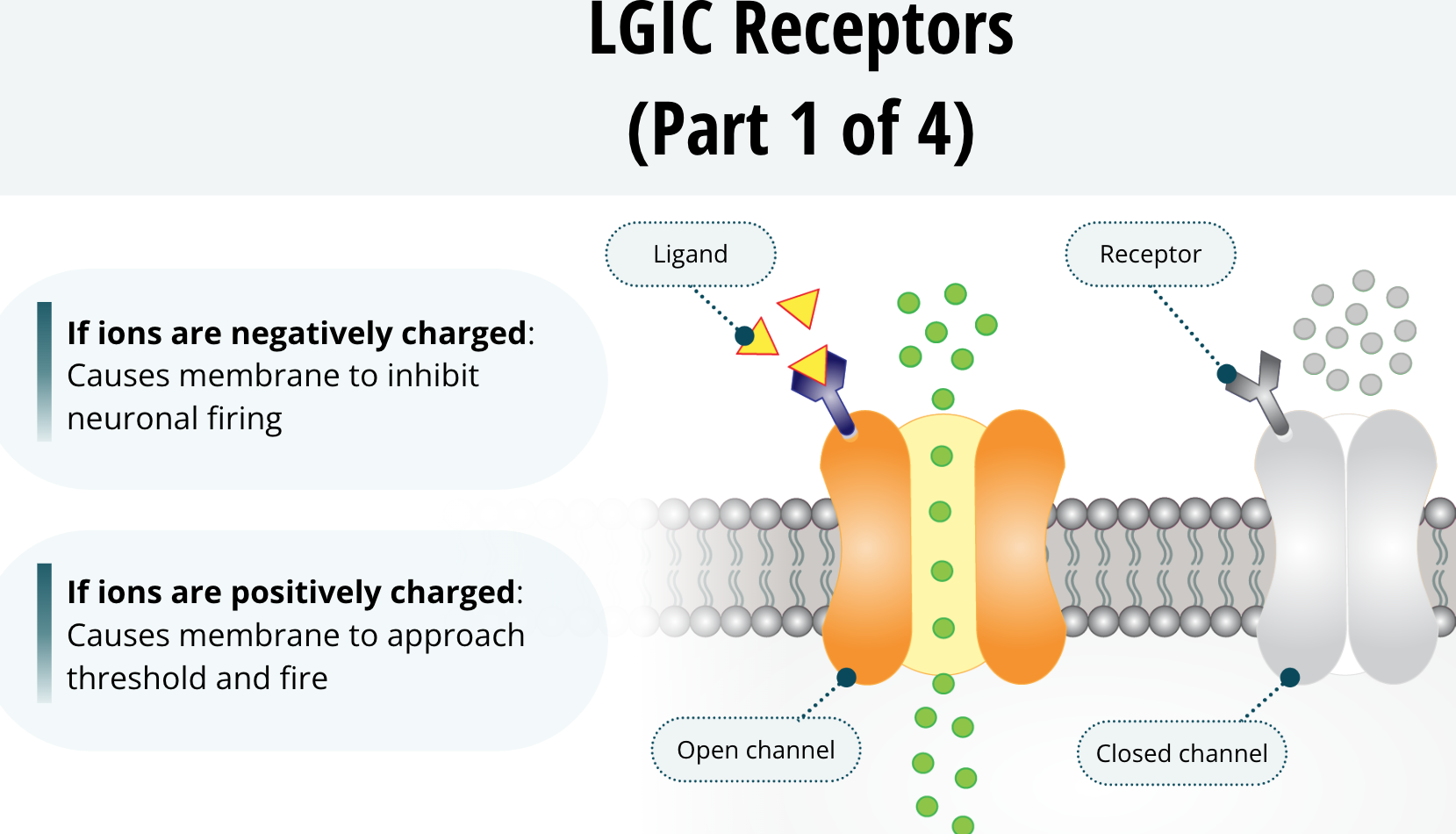 These receptors span the phospholipid bilayer of the neuronal membrane. When they are open, they allow ions to pass though the membrane. Think about how the sodium and potassium channels allow ions to pass through the membrane. These receptors are very similar to those ion channels, except, they can open or close depending on whether a ligand binds to them. Once the ligand does bind, the receptor undergoes a conformational change that opens the channel. This channel will allow select ions to flow across the membrane based upon their electrostatic and diffusional forces. Ultimately, it can cause the membrane to be more negatively charged and inhibit neuronal firing. Conversely, this could cause the membrane to be more positively charged toward threshold and fire.