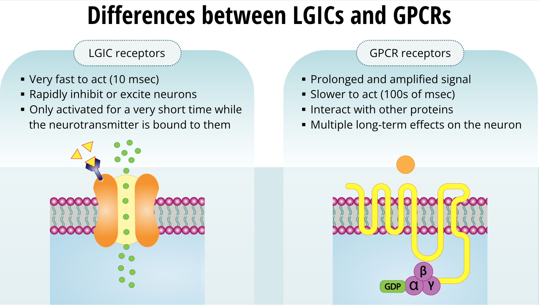 It appears that mother nature developed these two types of receptors for different functions. The LGIC receptors are very fast to act. They can act as fast as a 10 msec. They can rapidly inhibit or excite neurons. However, the drawback is that they are only activated for a very short time while the neurotransmitter is bound to them. Once the neurotransmitter decouples, the receptor actions on the neuron are finished. On the other hand, with GPCR receptors, the signal is both prolonged and amplified. The actions of these receptors are slower (at about 100s of msec) because they must interact with other proteins. Once they do, they have a bigger impact on the neuron. With these types of receptors, the actions last long after the neurotransmitter is no longer bound. Because these receptors interact with other proteins, and those interact with yet other proteins, the signal lasts a much longer time and the effects of one molecule of the neurotransmitter can have multiple long-term effects on the neuron. We will learn about those next.