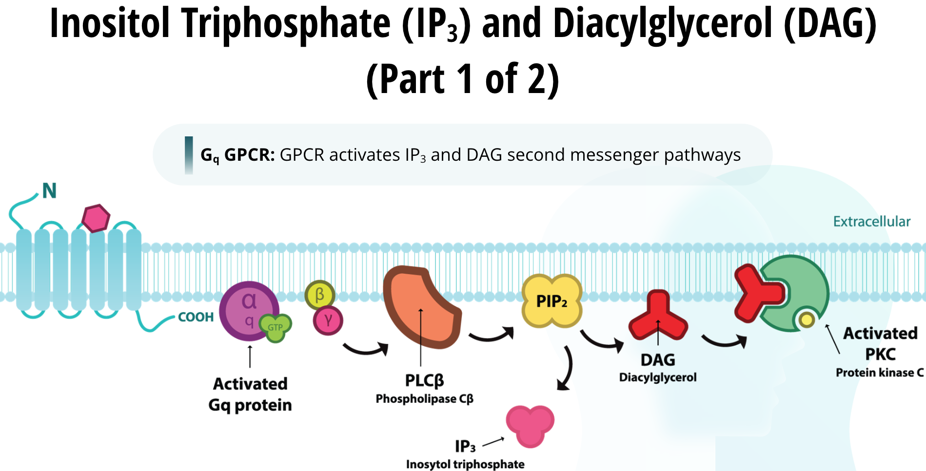When a GPCR activates the inositol triphosphate (IP3) and diacylglycerol (DAG) second messenger pathways, it is referred to as a Gq GPCR. When a Gq GPCR is activated by its neurotransmitter the beta/gamma subunits of the G-protein activate phospholipase C (PLC). PLC is a class of membrane-linked enzymes that chop up phospholipids. One particular phospholipid is PIP2 (which is an acronym for Phosphatidylinositol 4,5- bisphosphate). It is positioned within the cell membrane. Once PLC is activated by the G-protein, it cleaves PIP2 into two separate molecules called DAG and IP3. DAG remains lipophilic and stays within the fatty cell membrane. DAG is capable of activating a specific protein kinase called protein kinase C (PKC), which in turn produces its cellular effects by phosphorylating other proteins.
