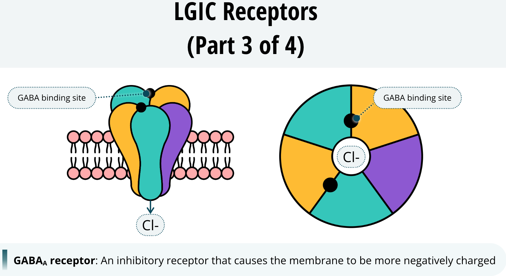 An example of a receptor that, when open, causes the membrane to be more negatively charged is the GABAA receptor. When this receptor is activated, its channel allows chloride ions to cross the membrane into the neuron. As these negatively charged ions enter the neuron, it maintains its negative charge making it more difficult to reach threshold and fire. This is why we say GABAA is an inhibitory receptor. When GABA binds to GABAA receptors, it inhibits the neuron from firing.