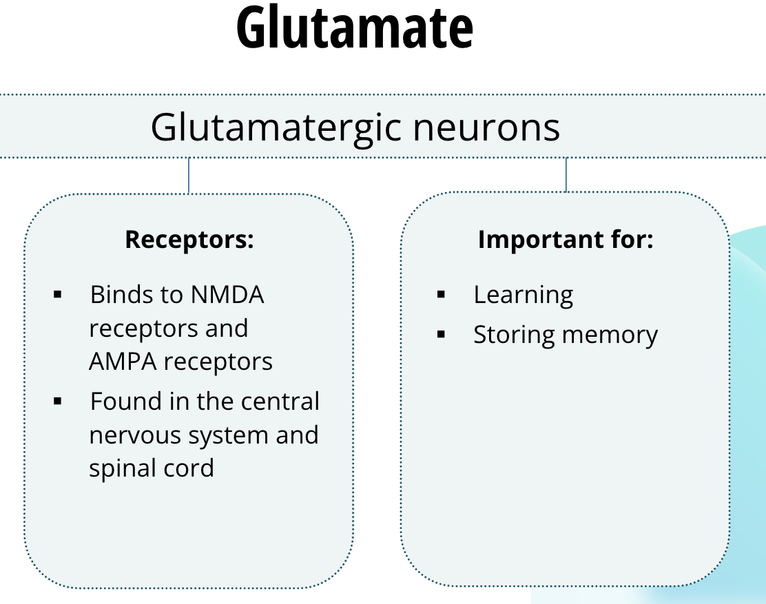 Neurons that release glutamate are called glutamatergic neurons. Glutamate binds to several families of receptors. Two important families are NMDA receptors and AMPA receptors. They are found abundantly throughout the central nervous system and glutamate is the principle excitatory neurotransmitter in the brain, as well as in the spinal cord. These receptors are vitally important for learning and memory. They are involved in neuroplasticity, which is a process by which pathways in the brain, especially at the synapse, are able to change or reorganize. Neuroplasticity is thought to be one way the brain learns and stores memories.