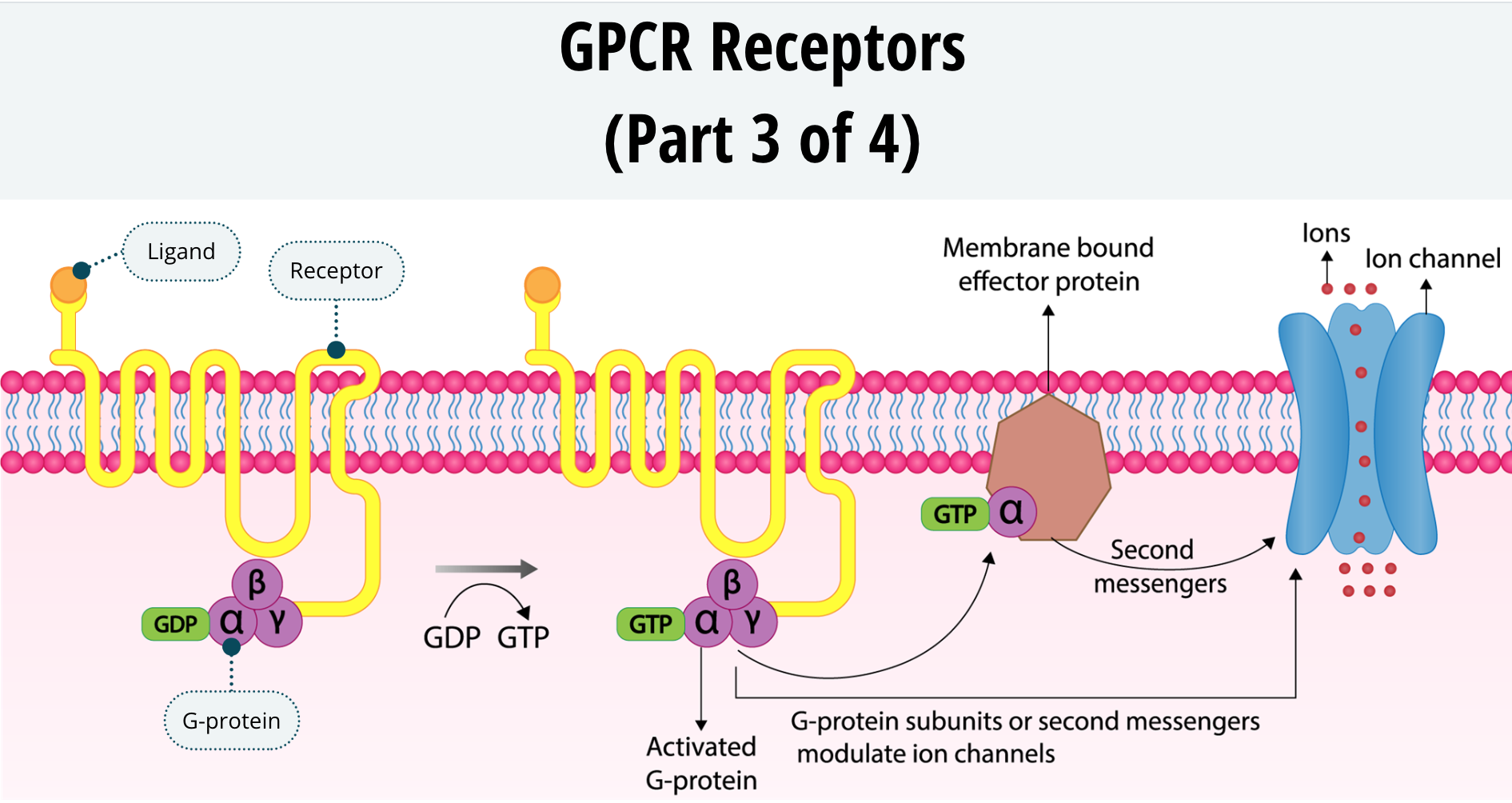 Once the GPCR is activated by a ligand, it will interact with the G-protein. Activation of the G-protein will cause it to decouple from the GDP and take on a GTP. Once the GTP is bound to the G-protein, the protein itself splits into two sections. The alpha subunit decouples and acts as a signalling mechanism within the neuron. Additionally, the beta and gamma subunits stay coupled to each other but also act as a signalling mechanism. The alpha subunit and the beta/gamma subunits of the G-protein can then cause longterm cellular changes within the neuron by either activating second messengers or modulating protein channels. You will learn more about second messengers later.