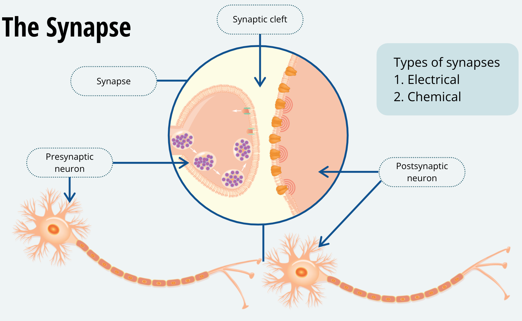 Now that you have an idea of how a neuron fires, it’s time to learn how each neuron conveys information to the subsequent neurons it communicates with. The junction between the terminal button of one neuron and the dendrite (or soma) of another neuron is called a synapse. There are two types of synapses, electrical and chemical. Electrical synapses are quite rare, and we won’t be covering them in this course. The chemical synapse is by far the most common form of communication between neurons. When describing the synapse, we call the neuron that is sending the message the presynaptic neuron and the neuron that is receiving the message, the postsynaptic neuron. Within the synapse, there is a tiny gap between the axon terminal of the presynaptic neuron and the membrane of the postsynaptic neuron. This gap is called the synaptic cleft.