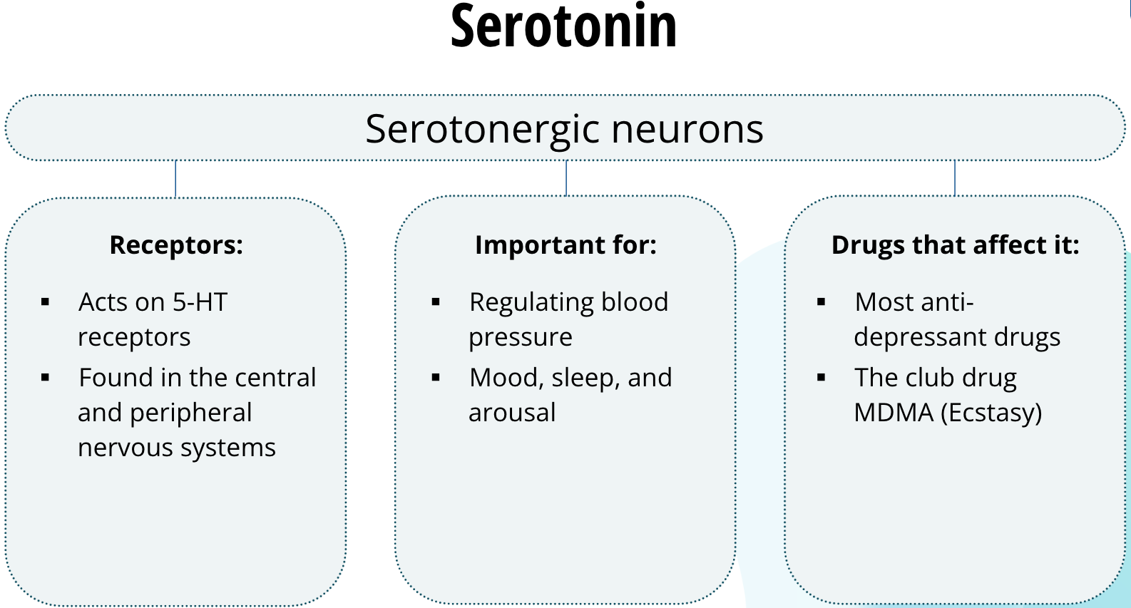 Neurons that release serotonin are called serotonergic neurons. Serotonin acts on a family of receptors called 5-HT receptors. These receptors are found in the central and peripheral nervous systems. In the peripheral nervous system, they are important for regulating blood pressure. In the central nervous system, serotonergic neurons are important for mood, sleep, and arousal. Most anti-depressant drugs act on serotonergic neurons to regulate serotonin neurotransmission, the dysregulation of which is thought to play a role in major depression. The club drug, MDMA, commonly called ecstasy, leads to increased serotonin in the synapse. It is believed that this increase in serotonergic neurotransmission relates to the drug’s mood elevating effects.