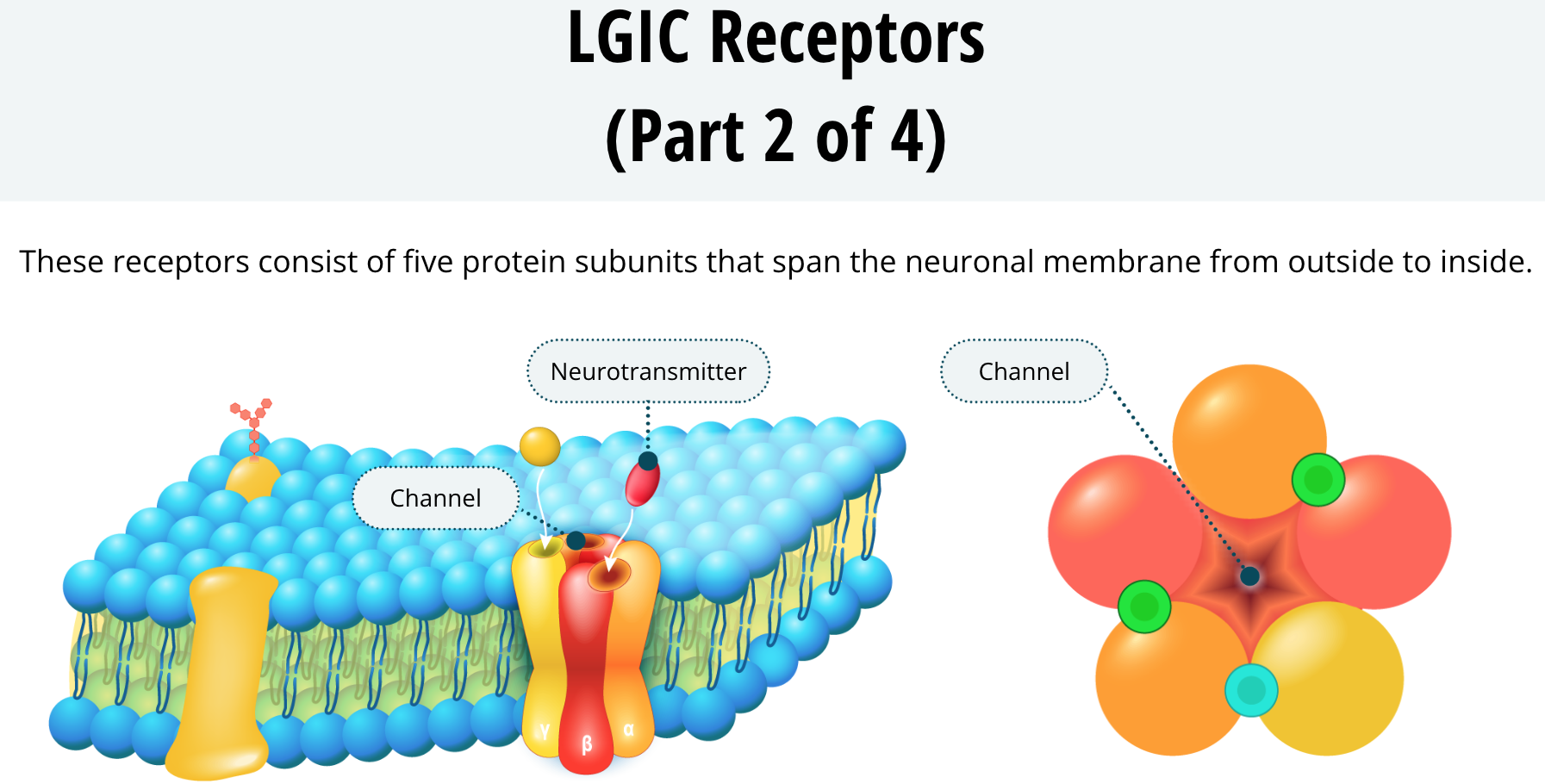 Something all LGIC receptors have in common is that they consist of five protein subunits that span the neuronal membrane from outside to inside. The five subunits form a circle with a channel in the middle.