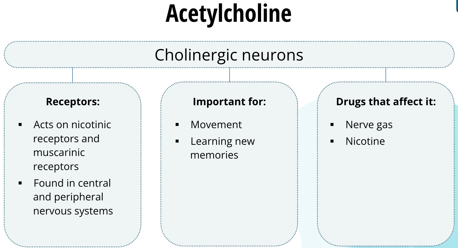 Neurons that release acetylcholine are called cholinergic neurons. Acetylcholine acts on two families of receptors: nicotinic receptors and muscarinic receptors. These receptors are found both in the central and peripheral nervous systems. In the peripheral nervous system, acetylcholine is the neurotransmitter responsible for signalling the muscles to contract. Thus, cholinergic neurons are important for movement. In the central nervous system, cholinergic neurons in the hippocampus are important for learning new memories. Drugs that act at cholinergic synapses in the peripheral nervous system include nerve gases. Nerve gas can block cholinergic neurotransmission to the muscles of the diaphragm and shut down the ability to breathe, causing the victim to suffocate. Another drug that acts on the cholinergic system is nicotine, yes, the same drug found in tobacco. Nicotine binds to nicotinic receptors and enhances cholinergic neurotransmission. It has been shown that nicotine can improve memory function, but that does not mean you should pick up smoking any time soon.