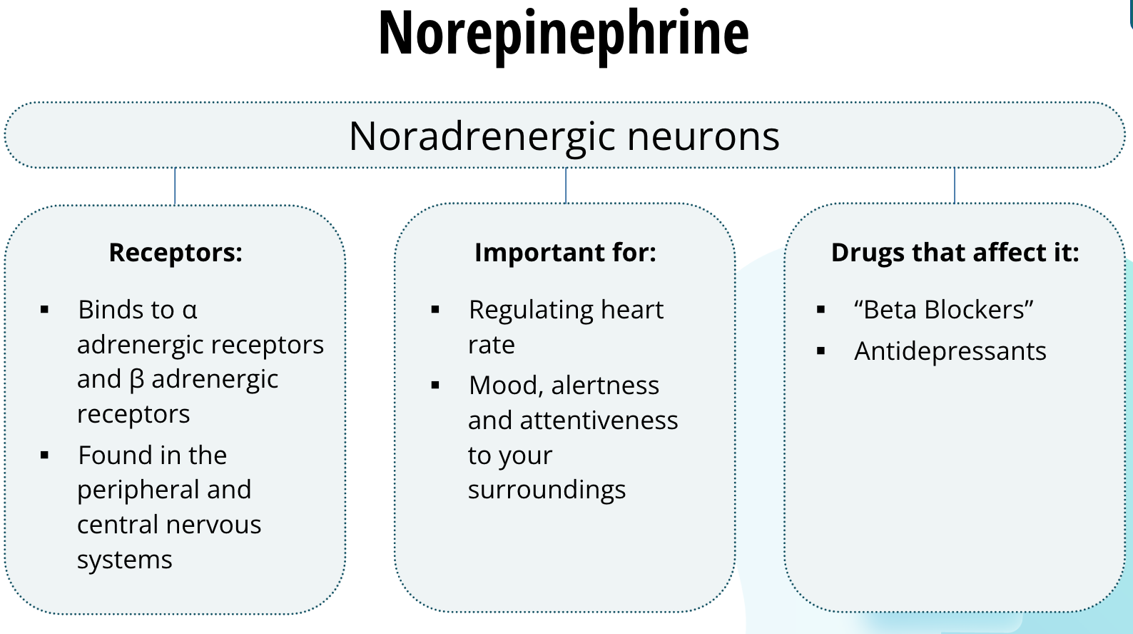 Neurons that release norepinerphrine, which is also called noradrenaline, are called noradrenergic neurons. The precise reason why we have two names for this neurotransmitter is not known — it is just to make the study ofneuroscience that much more complicated, I suppose. Norepinephrine binds to two families of receptors called α adrenergic receptors and β adrenergic receptors. They are found in the peripheral and central nervous systems. In the periphery, they are important for regulating heart rate. In the central nervous system, noradrenergic neurons are thought to be important for mood, alertness, and attentiveness to your surroundings. Patients who have recovered from a heart attack are often prescribed drugs called “Beta Blockers.” These drugs prevent norepinephrine from binding to the β adrenergic receptors and prevent the heart from beating too fast. Some classes of antidepressants also act on the noradrenergic system in the central nervous system.