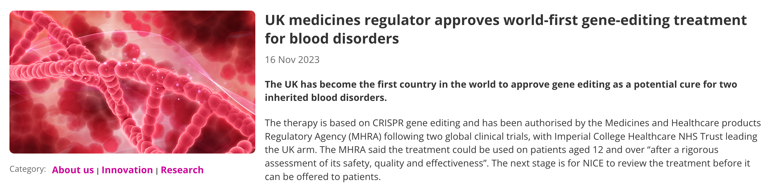 In 2020, a patient with sickle cell disease received CRISPR-edited stem cells.