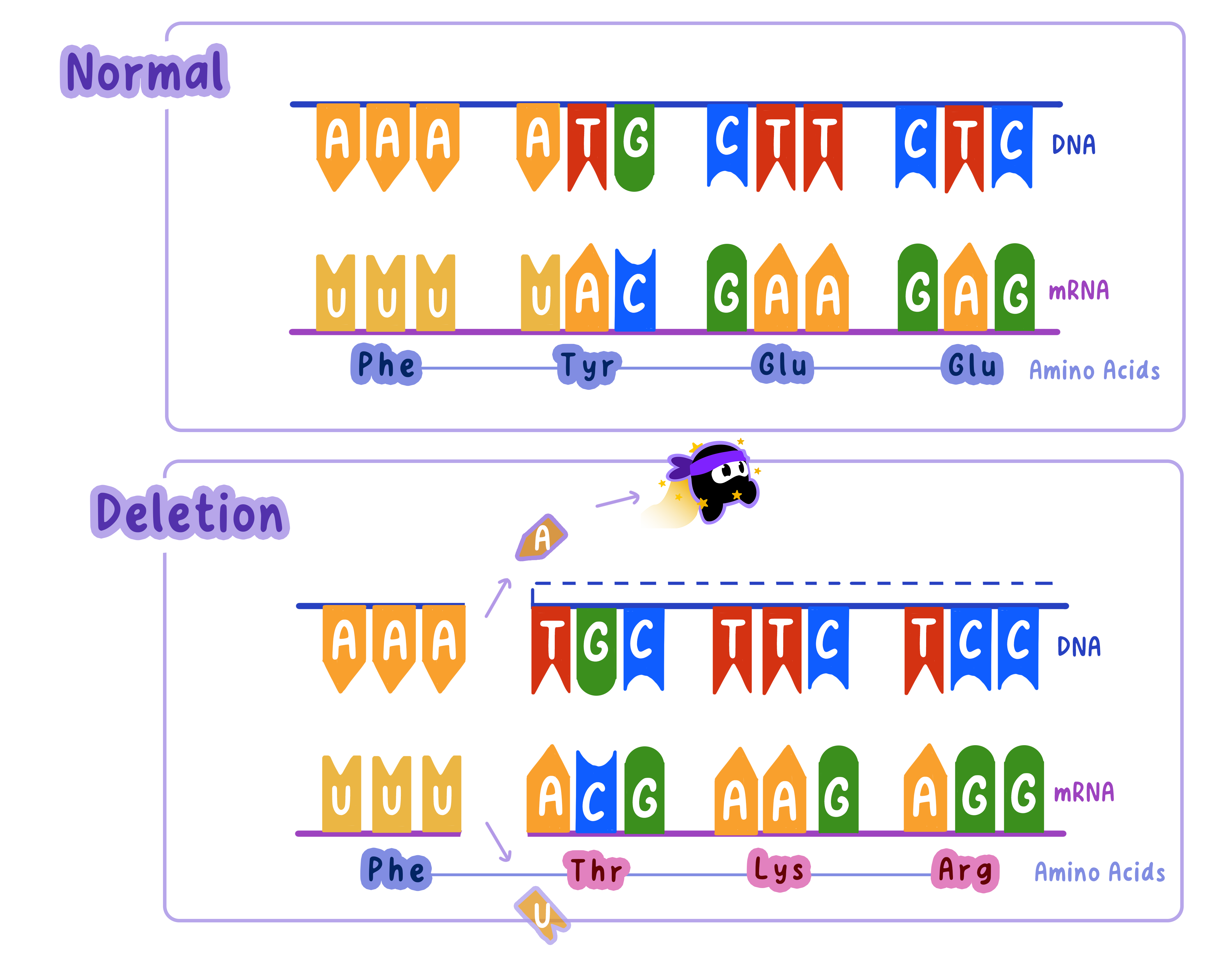 Like insertions, deletions can cause frameshifts unless the number of deleted bases is a multiple of three.