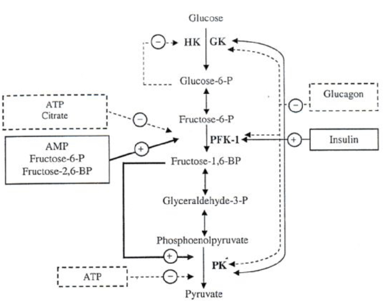 - Activated by: insulin, AMP, fructose-6-phosphate and fructose-2,6-bisphosphate