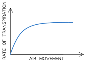 still air increases the humidity around the leaf so water molecules are not moved away as quickly