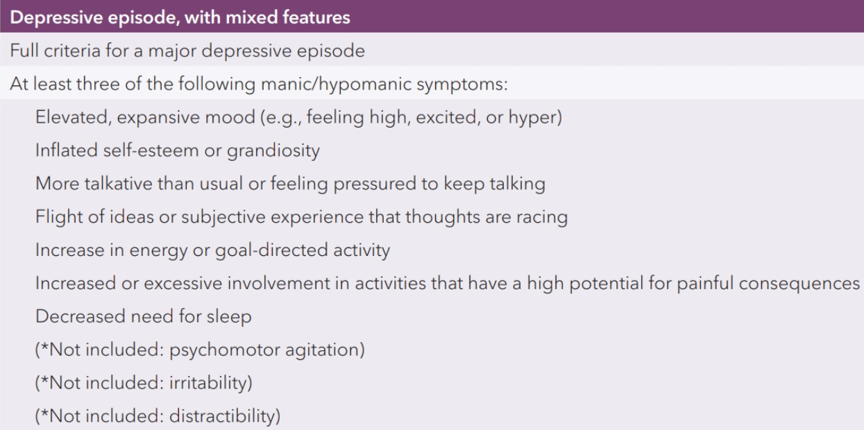 first-line treatment is one of the specifically approved serotonin/dopamine blockers, not a monoamine reuptake inhibitor (for dpn w/ mixed features or bipolar)