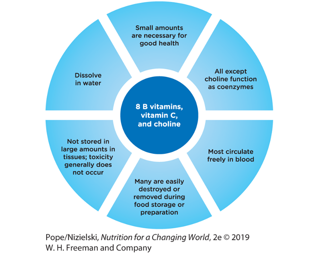 Water-soluble vitamins include the B vitamins, vitamin C, and the vitamin-like nutrient, choline