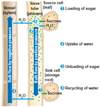 (True) - At the sink, sugar molecules diffuse from the phloem to sink tissues and are followed by water.