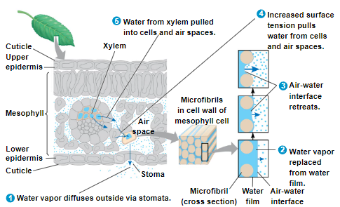 Negative Pressure Potential - Created at the air-water interface, it pulls water molecules from more hydrated areas of the leaf.