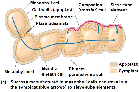 (True) - Depending on the species, sugar may move by symplastic or both symplastic and apoplastic pathways.