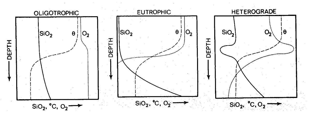 Heterograde lakes have algae blooms that photosynthesize and diatom blooms leading to an increase in both silica and phosphorus