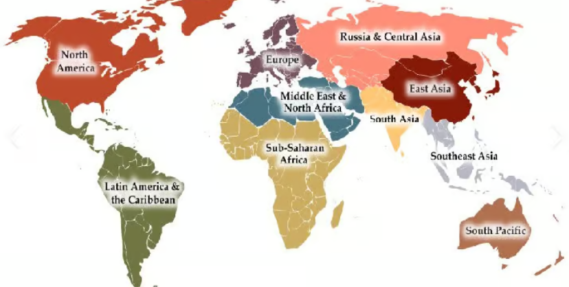 Political (Brazil), physical (the Sahara), cultural (southwestern Nigeria, where most speak Yoruba), economic (the Gold Coast of Africa, which exports gold)