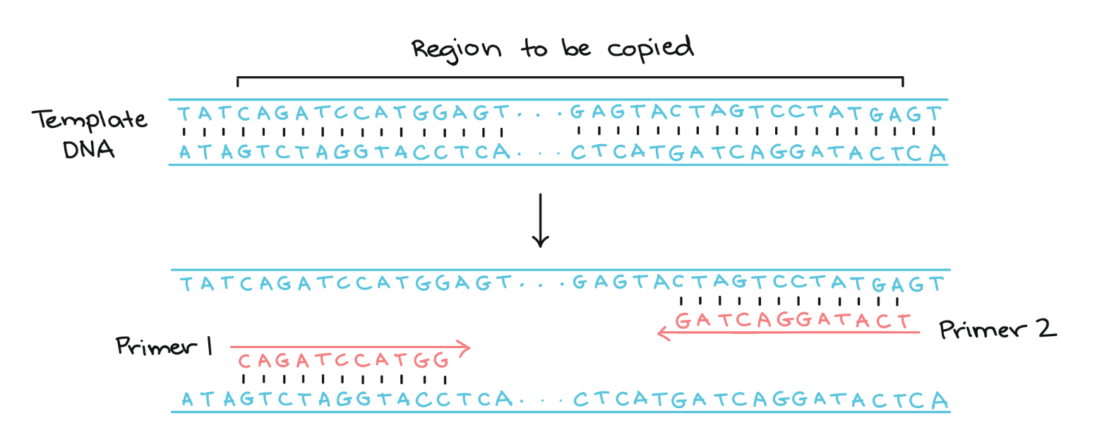 Hieronder voorgesteld is ons gen van interesse, gelegen tussen beide primers. Merk op dat de eigenlijke DNA strengen veel langer zijn en doorlopen langs beide kanten (3’ en 5’). Het “overhangend” eindje is daarbij niet complementair met die strengen en hangt dus los.