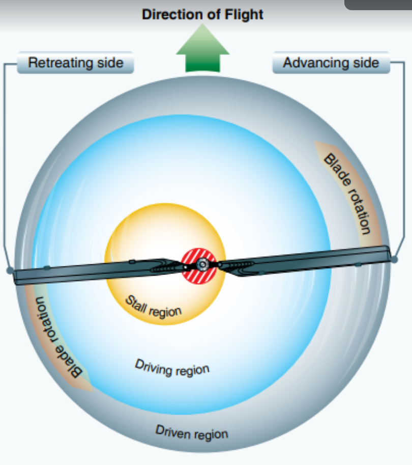 Since forward speed changes the inflow of air up through the rotor disk, all three regions move outboard along the blade span on the retreating side of the disk where AOA is larger.