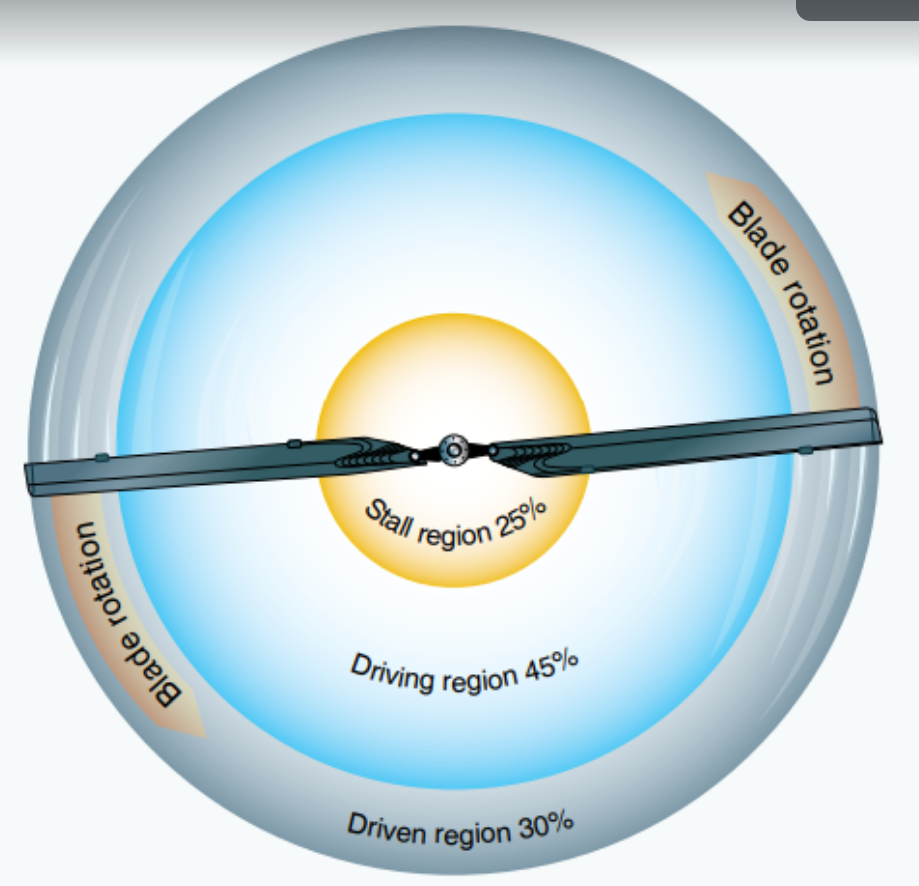 Operates above its maximum AOA (stall angle), causing drag, which tends to slow rotation of the blade.
