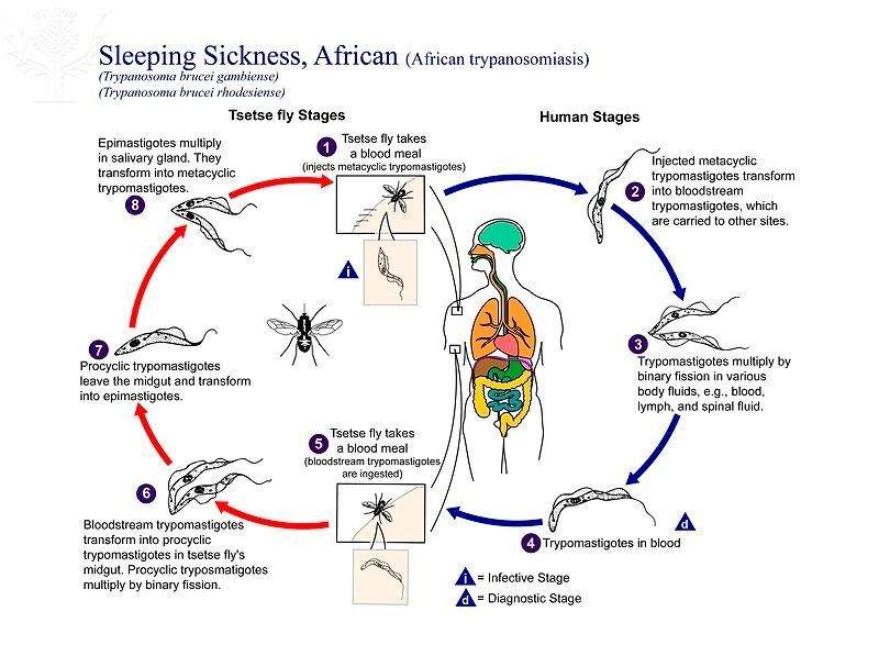 The parasitic protist Trypanosoma brucei is transmitted to humans through the bite of a tsetse fly, which is found in numerous countries of sub-Saharan Africa. Once transmitted, Trypanosoma brucei causes a disease called the African Sleeping Sickness. In the first stage of the disease, symptoms include fever, headache, pain in the joints, and itchiness. During the second stage of the disease, confusion, numbness, and trouble sleeping begin.