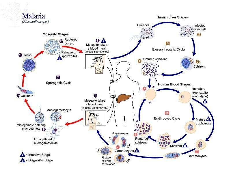 Malaria parasites have a complex life-cycle. Part of their life is in a mosquito where they can be transmitted to humans through a mosquito bite. Once in the human, they inhabit the liver and then move into red blood cells.