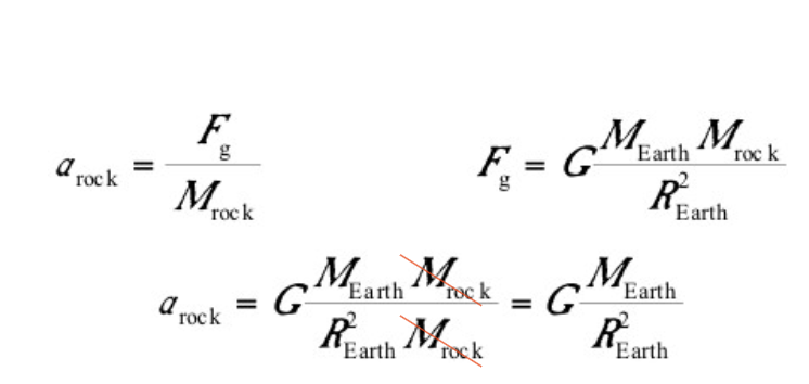 The gravitational acceleration of an object like a rock does not depend on its mass because M rock in the equation for acceleration cancels M rock in the equation for gravitational force.