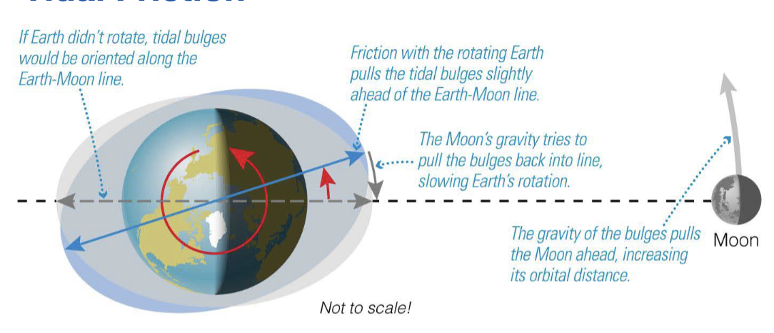 Tidal friction gradually slows Earth’s rotation (and makes the Moon get farther from Earth).