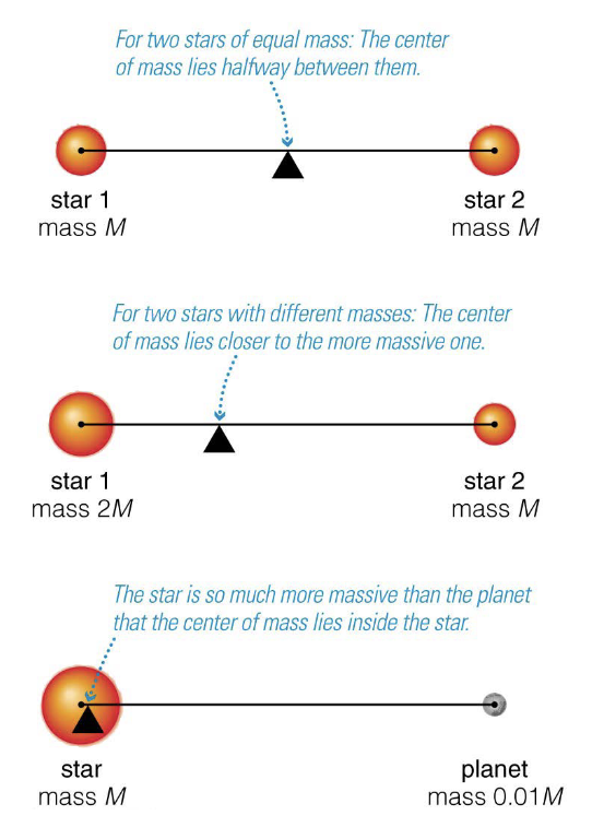 Because of momentum conservation, orbiting objects orbit around their center of mass.