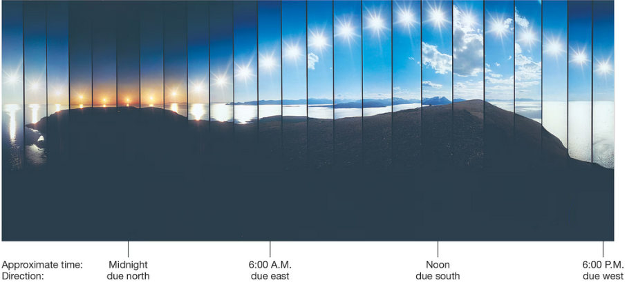 This sequence of photos shows the progression of the Sun around the horizon on the June solstice at the Arctic Circle. Notice that the Sun skims the northern horizon at midnight, then gradually rises higher, reaching its highest point when it is due south at noon