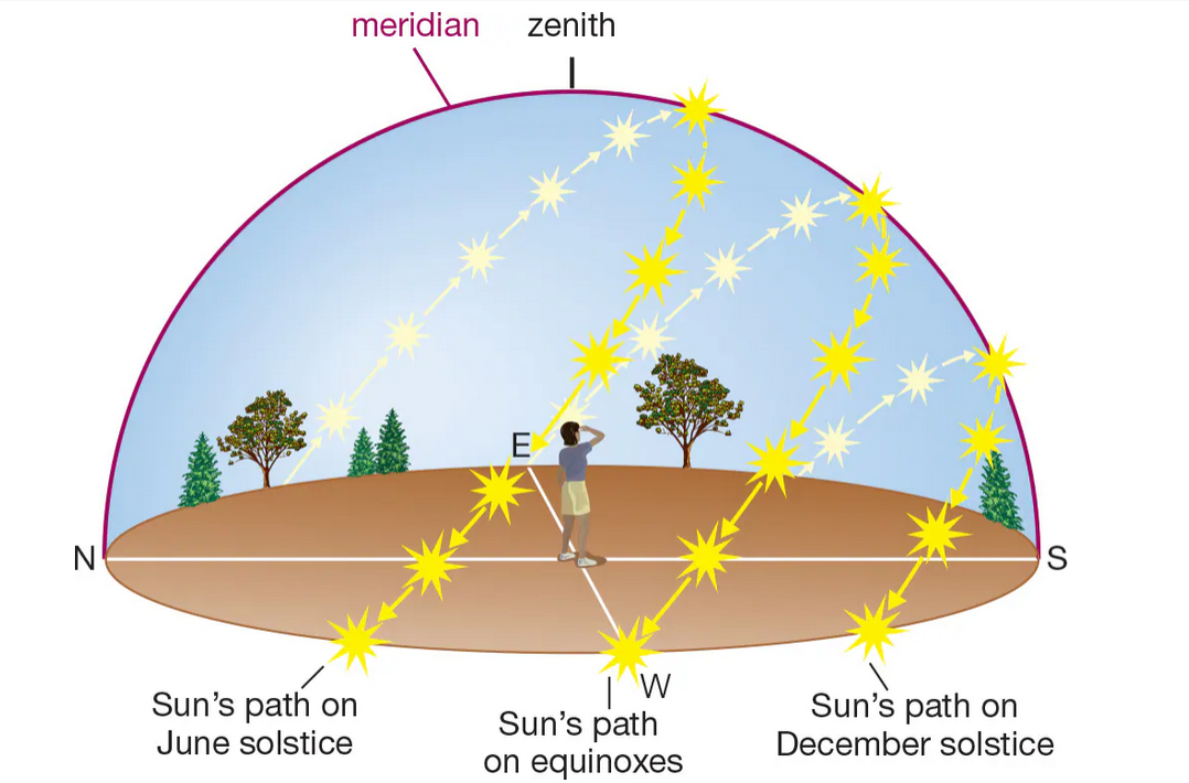 This diagram shows the Sun’s path on the solstices and equinoxes for a Northern Hemisphere sky (latitude 40°N). The precise paths are different for other latitudes; for example, at latitude 40°S, the paths look similar except tilted to the north rather than to the south.