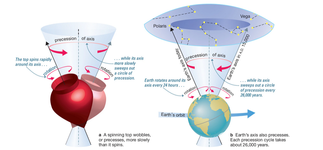 ☼ Each cycle of Earth’s precession takes about 26,000 years. This gradually changes the direction in which the axis points in space.