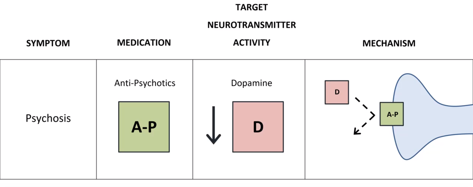 psychotic symptoms correlated with increased dopamine. Thus, antipsychotic medications attempt to reduce psychotic symptoms by reducing dopamine activity. The antipsychotic medications bind and hold onto postsynaptic dopamine receptors, preventing the dopamine from \n binding and rendering it ineffective.