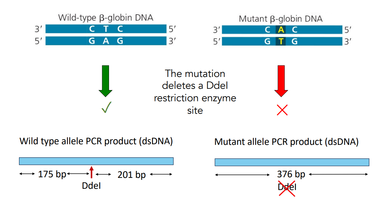Interpreting Results: Detecting Changes in Restriction Sites (PCR-RFLP) Example of a Loss of a restriction site: Sickle Cell Anemia