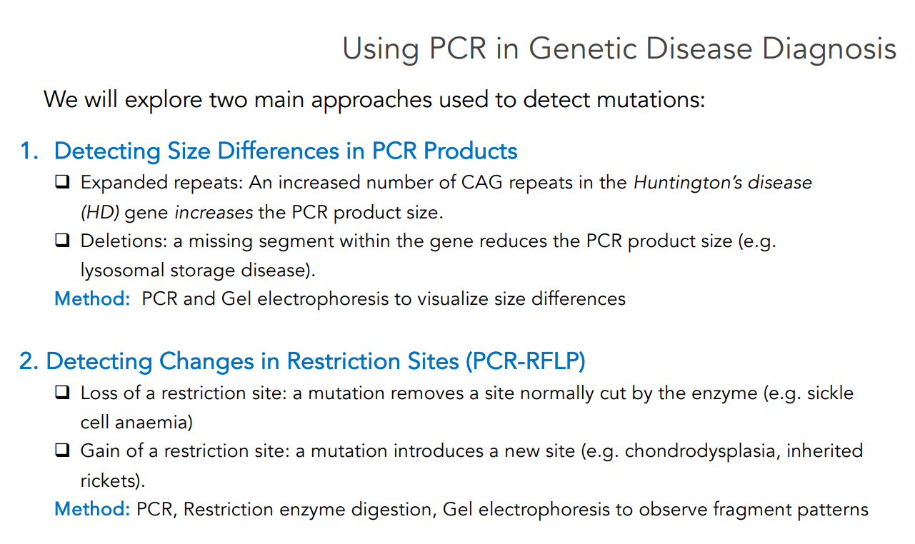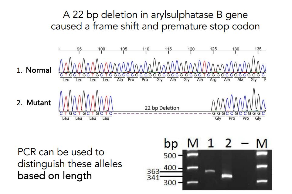 Deletions: A missing segment within the gene reduces the PCR product size (e.g. lysosomal storage disease).