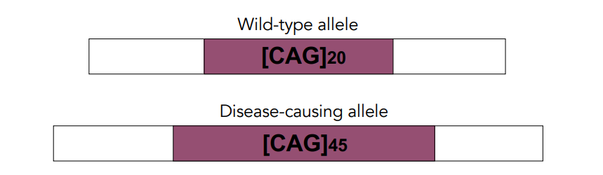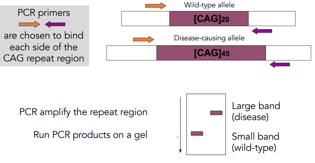 Expanded repeats: An increased number of CAG repeats in the Huntington’s disease (HD) gene increases the PCR product size.