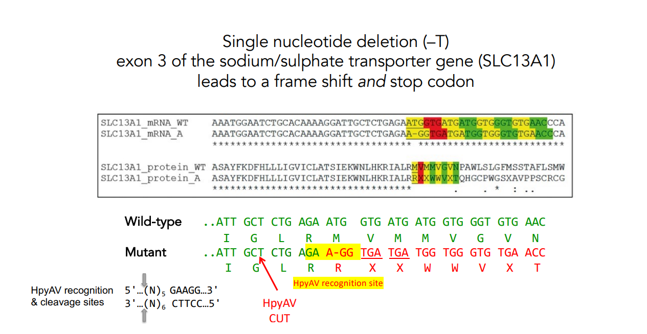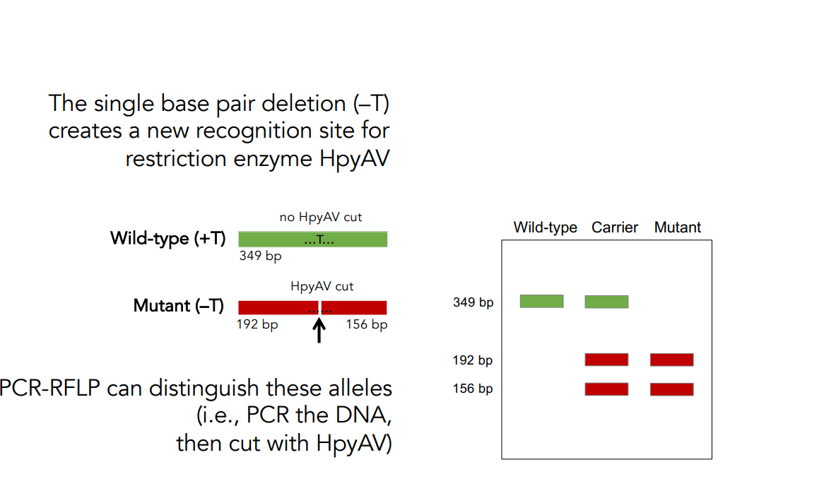 The single base pair deletion (–T) creates a new recognition site for restriction enzyme HpyAV.