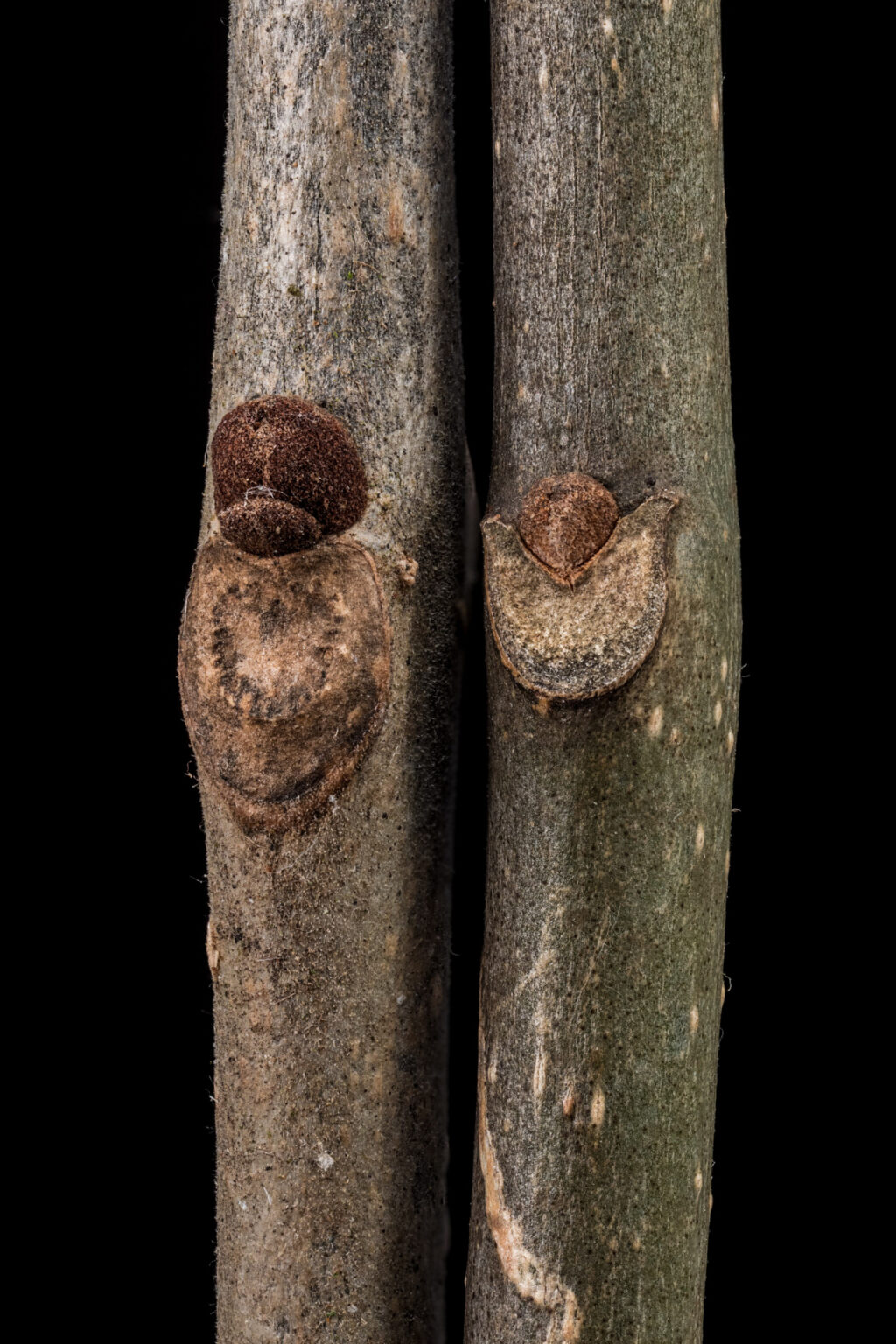 How to recognize white ash: Getting to ash is easy; it’s a tree with opposite pinnately compound leaves. Carrying on, the leaflets are stalked (eliminate black ash) and the twigs are round (eliminate blue ash), and you end up in the white ash versus green ash circle of confusion. Two things tell you it’s white ash: the upland habitat, and U-shaped leaf scars (on right- green on left)