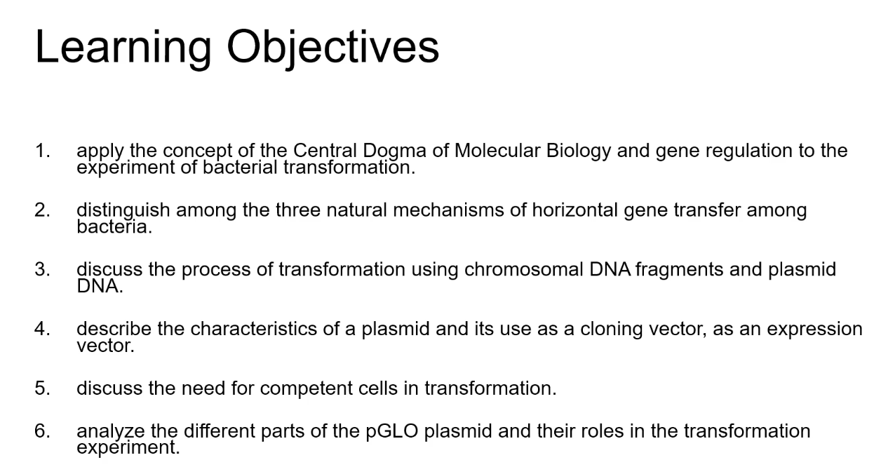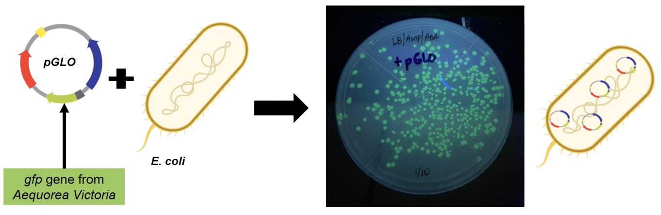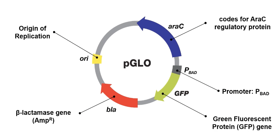 The pGLO plasmid is composed of the origin of replication, ampicillin resistance gene, the AraC gene, and the GFP gene that is regulated by the PBAD promoter.