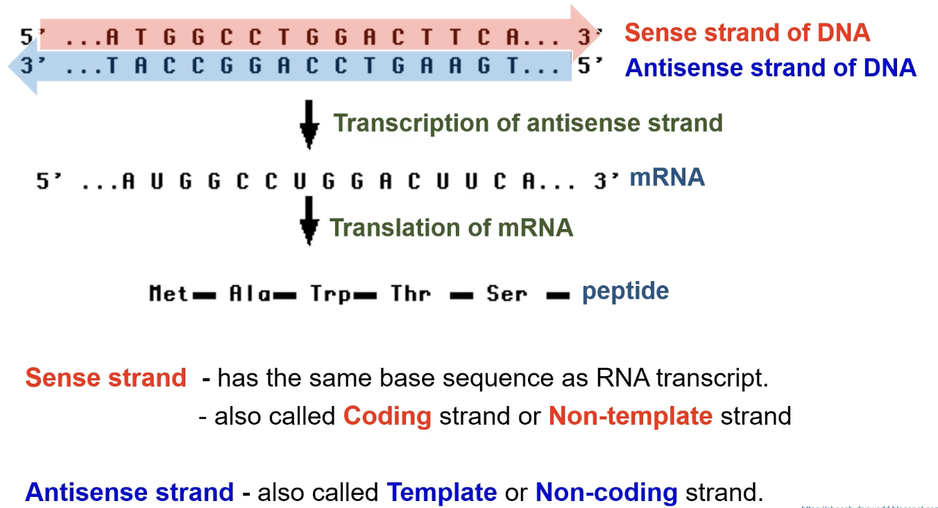 - Sense strand has the same base sequence as RNA transcript