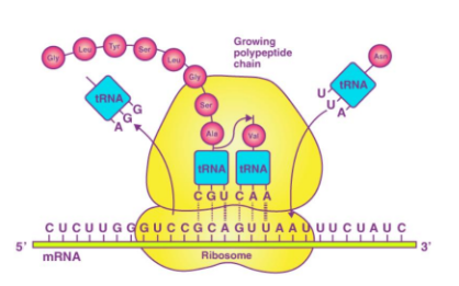 During translation, mRNA codons are read by ribosomes, and tRNA delivers corresponding amino acids.