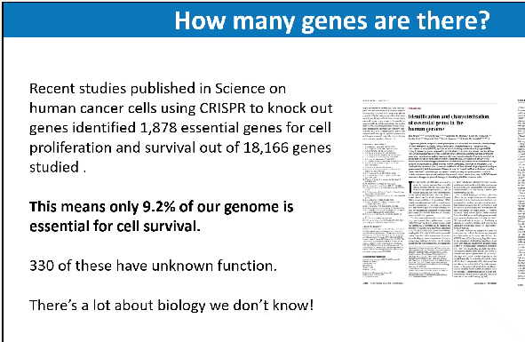 Human genome has roughly 22,000 genes; statistics for other organisms vary.