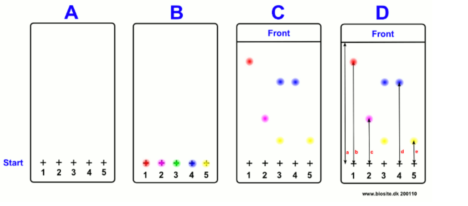 To compare the running length of the spots, RF values are used. (Relative to Front or retardation factor).