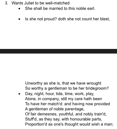 Disagreement Without Confrontation: Although Lady Capulet initially agrees with her husband that Juliet is too young to marry, she does not challenge him when he changes his mind: “So shall you share all that he doth possess, / By having him, making yourself no less” (Act 1, Scene 3). This quote demonstrates her subtle shift to align with Lord Capulet’s view, prioritizing obedience over her own opinions.