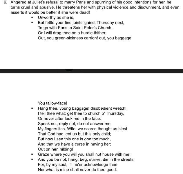 Appeals to Lord Capulet’s Authority: When Juliet refuses the marriage to Paris, Lady Capulet tells her husband, “I have done with thee” (Act 3, Scene 5), signaling that she has given up trying to convince Juliet and leaving the matter in her husband’s hands. This quote shows how she relinquishes control to Lord Capulet, adhering to the traditional hierarchy of their marriage.