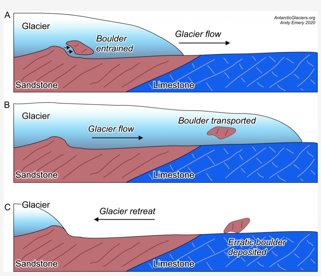 Glaciers erode underlying bedrock through plucking - these rocks (erratics) are transported a distances (sometimes very far) by the glacier