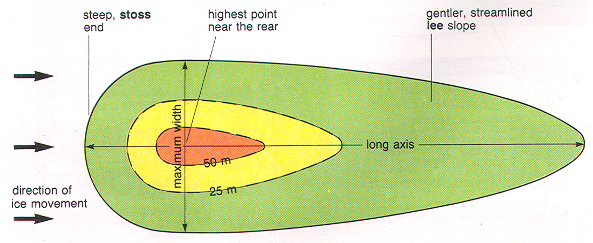 They have a steep and blunted stoss end facing the direction from which the ice advanced, and a more streamlined lee end (downstream), minimising resistance to the surrounding moving ice.